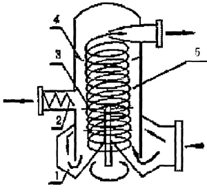 1、熱風(fēng)分配器 2、螺旋加料器 3、攪拌器 4、分級器 5、旋轉(zhuǎn)干燥室