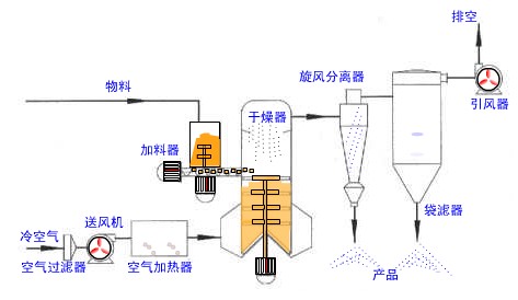 旋轉(zhuǎn)閃蒸干燥機(jī)的干燥系統(tǒng)主要由空氣過濾器、加熱器、加料器、熱風(fēng)分布器、閃蒸干燥主機(jī)、分級室、旋風(fēng)分離器、布袋除塵器以及引風(fēng)機(jī)等主要設(shè)備及附件構(gòu)成。