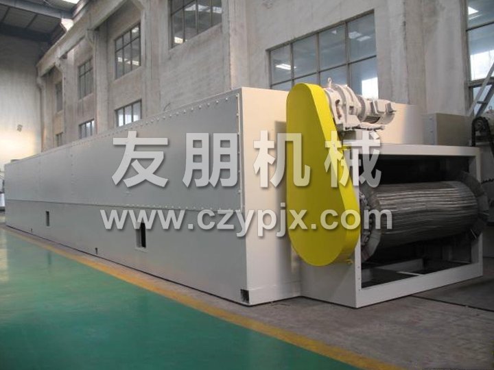 整個(gè)生產(chǎn)線為全封閉型(對(duì)物料而言),分別由擺動(dòng)布料段、干燥段、出料段三部分組成。擺動(dòng)布料段作用是使海藻均勻分散在網(wǎng)板上,并且勻速輸送到干燥段。海藻先后經(jīng)過(guò)80℃熱風(fēng)干燥段,90℃熱風(fēng)干燥段和120℃熱風(fēng)干燥段后,再經(jīng)過(guò)出料段排料。各單元內(nèi)的循環(huán)風(fēng)方向根據(jù)物料干燥階段不同和工藝要求需要,可采用向下式,向上式或兩者交替進(jìn)行。干燥加熱所需熱風(fēng)由引風(fēng)機(jī)吸入,并在風(fēng)機(jī)出風(fēng)口首先經(jīng)預(yù)分布器,再經(jīng)過(guò)孔板均風(fēng)后,熱風(fēng)從物料的下面向上(或從物料的上面向下)穿透物料層,對(duì)物料進(jìn)行加熱。